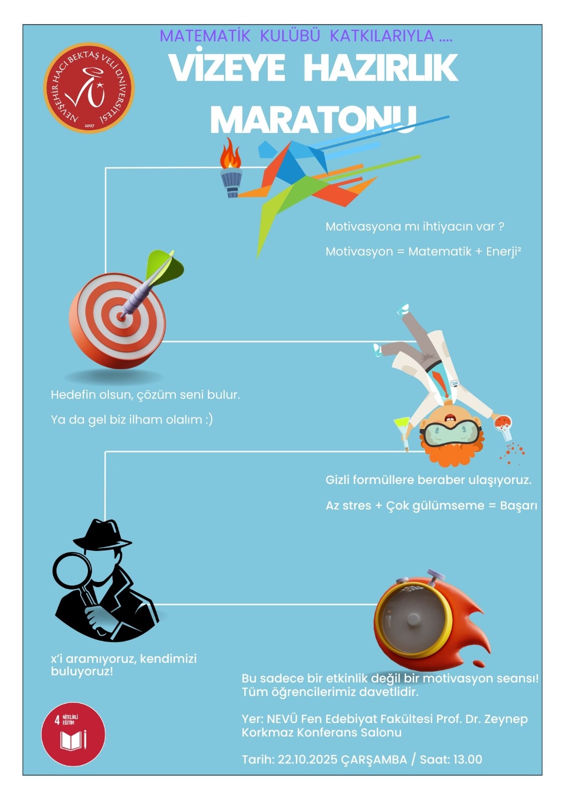 Nevşehir Hacı Bektaş Veli Üniversitesi Matematik Kulübü tarafından, öğrencilerimizin vize sınavları öncesinde motivasyonlarını artırmak amacıyla “Vizeye Hazırlık Maratonu” adlı etkinlik düzenlenecektir.