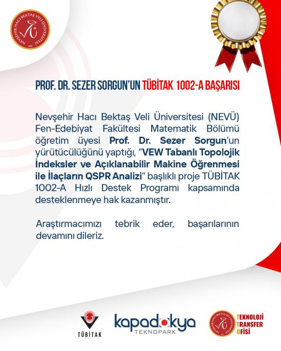 Fen-Edebiyat Fakültesi Matematik Bölümü öğretim üyesi Prof. Dr. Sezer Sorgun’un yürütücülüğünü üstlendiği “VEW Tabanlı Topolojik İndeksler ve Açıklanabilir Makine Öğrenmesi ile İlaçların QSPR Analizi” başlıklı proje, TÜBİTAK’ın “1002-A Hızlı Destek Programı” kapsamında destek almaya hak kazandı.
