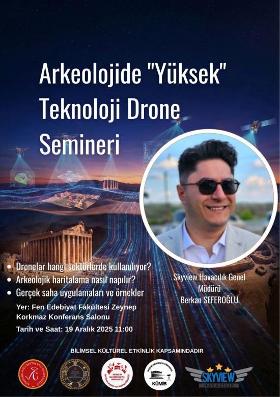 19 Aralık 2025 saat 11:00'de Fen Edebiyat Fakültesi Prof. Dr. Zeynep Korkmaz Konferans Salonu'nda "Arkeolojide Yüksek Teknoloji Drone Semineri" etkinliği gerçekleştirilecektir.