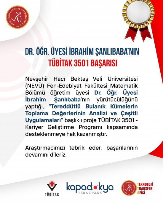 Nevşehir Hacı Bektaş Veli Üniversitesi Fen-Edebiyat Fakültesi Matematik Bölümü öğretim üyesi Dr. Öğr. Üyesi İbrahim Şanlıbaba’nın yürütücülüğünü yaptığı “Tereddütlü Bulanık Kümelerin Toplama Değerlerinin Analizi ve Çeşitli Uygulamaları” başlıklı proje, TÜBİTAK 3501 - Kariyer Geliştirme Programı kapsamında desteklenmeye hak kazanmıştır.